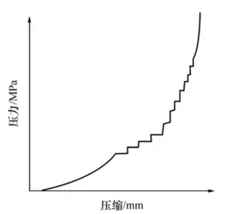 在這個階段中,耐火磚成型壓力已增加到能使泥料內顆粒發生脆性和彈性變形的程度,所以在壓制時由于泥料內顆粒受壓變形和多角型顆粒的棱角被壓掉,從而使坯體內顆粒間的接觸面增加,摩擦阻力增大。因此,使這一階段的壓制特性表現為跳躍式的壓縮變化,即呈階梯形變化曲線;當壓制進入第三階段時,成型壓力已超過臨界壓力,即使壓力再升高,坯體幾乎不再被壓縮。下圖的這種耐火磚對模具的要求和壓力機的選擇都要求很高。